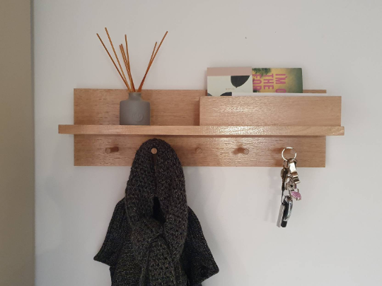 Tasmanian Oak timber shelf with black double hooks.